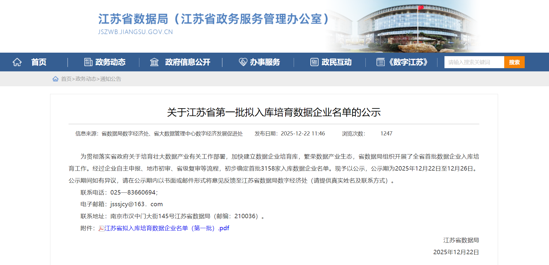 针对入库培育的数据企业,江苏省数据局将会同有关部门,进一步加强政策扶持力度,组织开展供需对接、智算支持、人才服务、融资服务、价值创新、企业出海等系列活动。支持、辅导有意愿的入库数据企业积极申报“数据要素×”等典型案例示范以及各类企业榜单遴选活动。择优推荐申报国家、省数据产业相关项目扶持。
